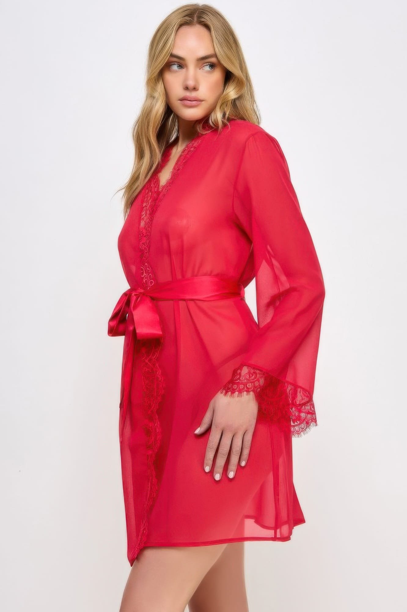 Elegant and timeless, the Vivian Robe blends delicate chiffon with romantic lace for a truly refined look. The semi-sheer bodice offers a glimpse of allure, while the intricate floral lace trim and collared neckline add classic charm. Designed with long sleeves and a satin front tie belt, this robe delivers both comfort and sophistication. Perfect for special evenings or leisurely mornings, it drapes beautifully on the body for a flattering silhouette. Make every moment feel luxurious with this fem…