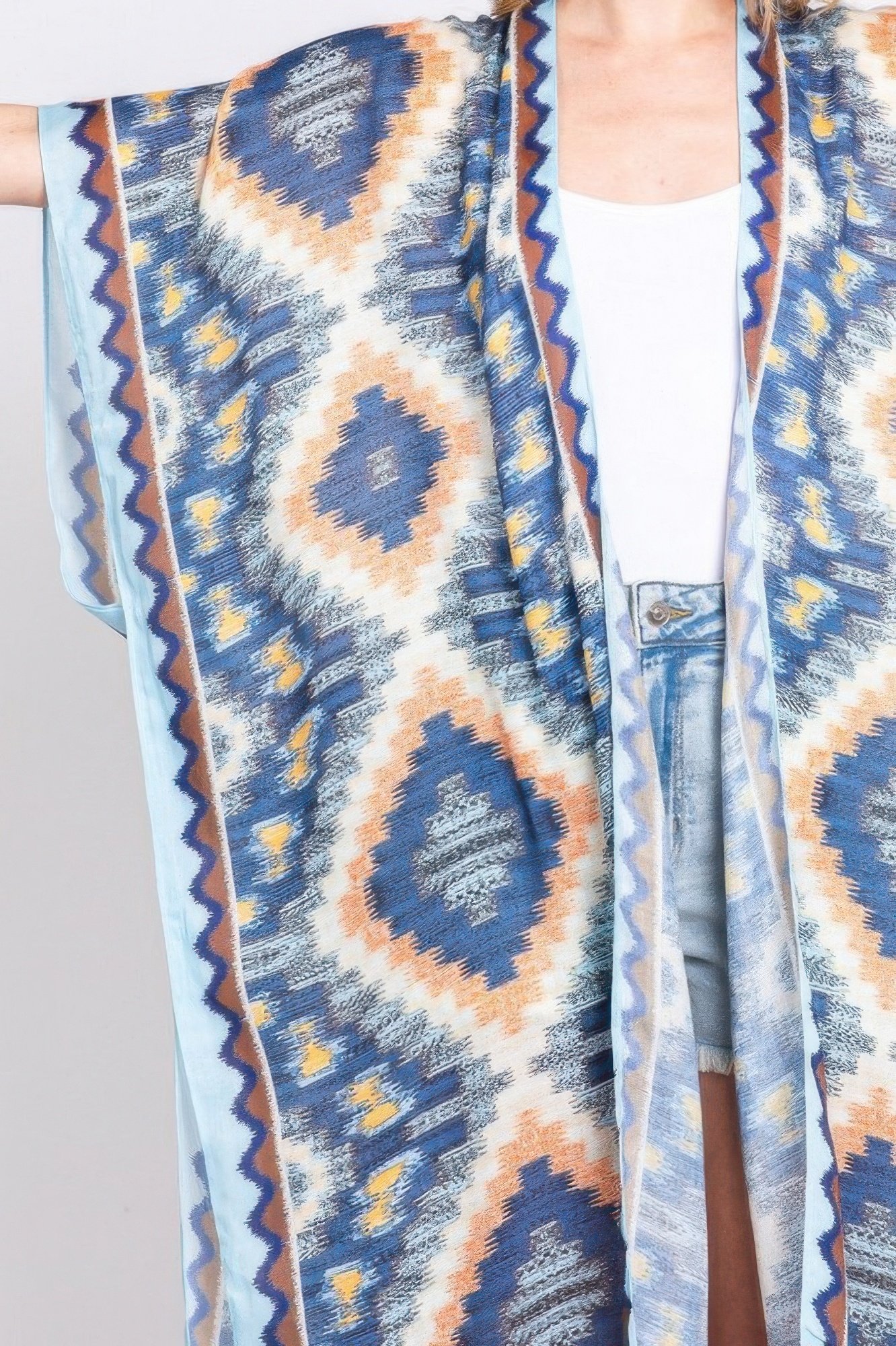 Product Description: Add a bohemian touch to your wardrobe with the Aztec Print Open Front Long Kimono