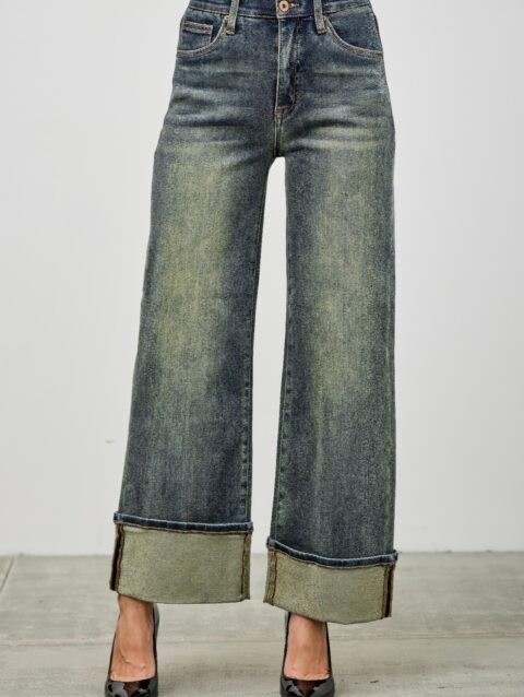High Rise Dirty Wash Cuffed Jeans With Stretch
