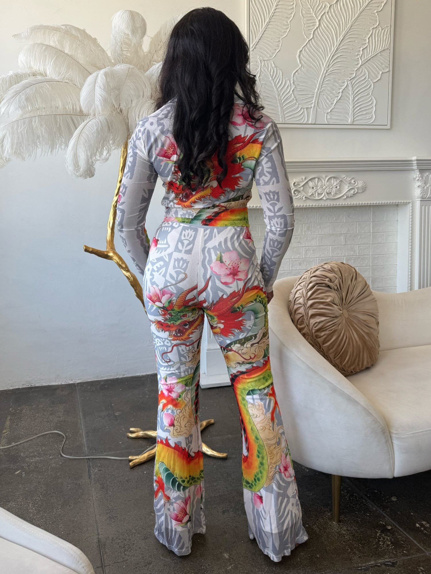 Unleash your inner empress in the Dragon Bloom Set—a commanding blend of bold print and effortless elegance. This two-piece mesh ensemble features a sheer button-down top that flows with ease, perfectly balanced by fully lined flare pants for a confident, comfortable fit. The vivid dragon and lotus print brings fierce symbolism and elevated style to the forefront. Lightweight and statement-making, this set is designed to turn heads from resort escapes to night-out moments.