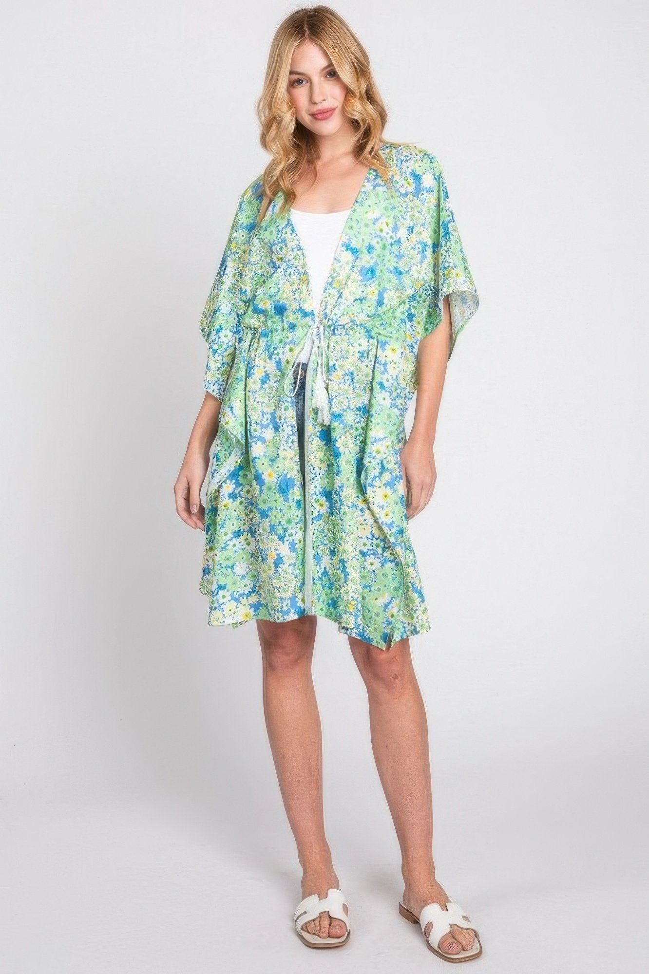 Add a touch of floral elegance with this Self-tie Drawstring Open Front Cover. Designed in lightweight polyester, it features a breezy, romantic silhouette with a cinchable waist for definition. Ideal for sunny days, it transitions effortlessly from casual wear to beach cover-up.