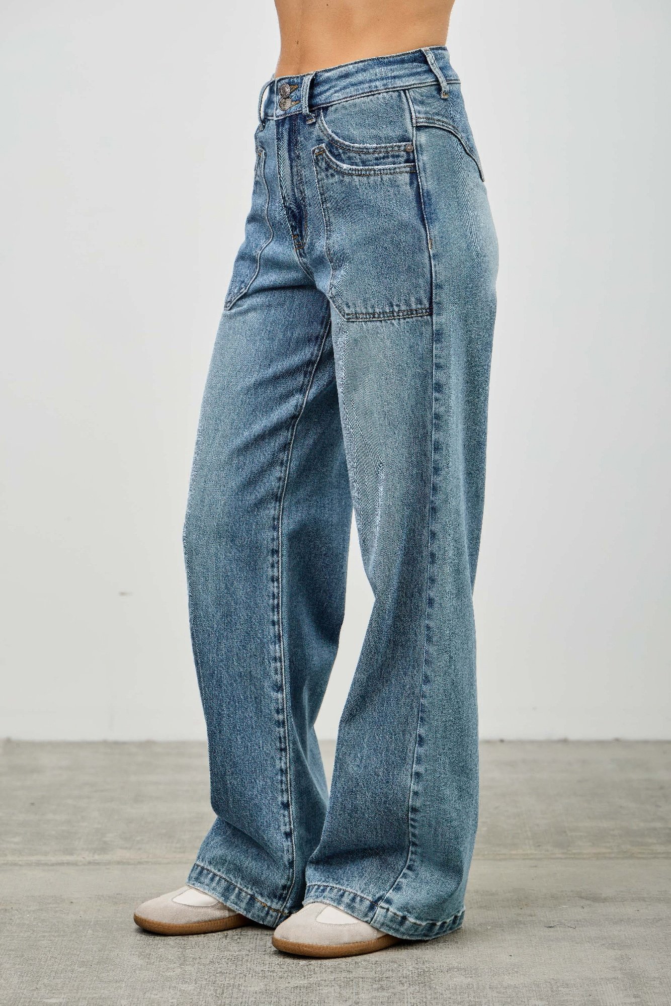 These high rise double pocket wide leg jeans offer a fresh blend of utility and style. Featuring patched front pockets and a wide leg silhouette, they’re designed to flatter the waist while providing a relaxed yet structured fit. Available in both stretch and non-stretch fabric options, they cater to your preferred feel and fit. The high-rise waist with a zipper fly enhances the streamlined look, while the wide leg makes a bold, fashion-forward statement. Perfect for pairing with fitted tops or tucked-in layers.