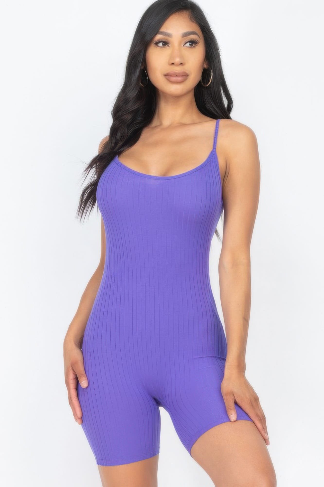 Step out in style with the Bodycon Romper, a must-have for fashion-forward wardrobes. This Ribbed Romper features a scoop neckline, spaghetti straps, and a mini biker short cut that hugs your curves for a flattering fit. Made from stretchy ribbed knit fabric, it moves with you, offering comfort whether lounging at home, layering for street style, or stepping out in sporty-chic fashion.