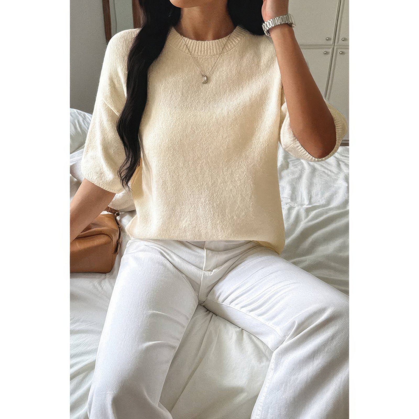 Solid Round Neck 3/4 Sleeve Sweater Top