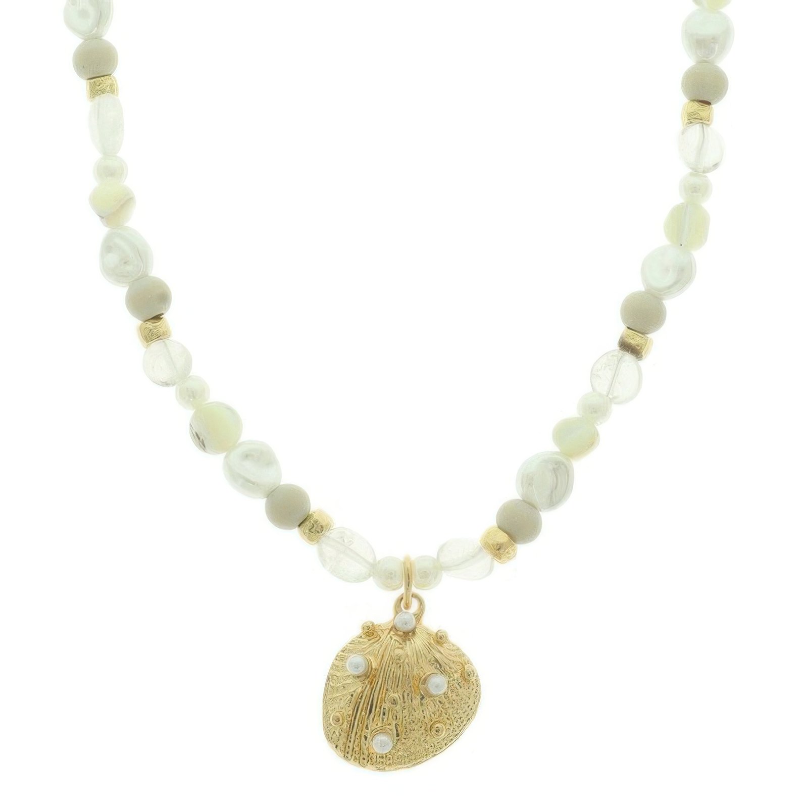 Channel seaside charm with this scallop shell pendant pearl bead necklace. Set in yellow gold-tone metal, the necklace features a detailed shell pendant paired with lustrous pearl beads. Its ocean-inspired design makes it the perfect accessory for vacations, summer events, or beachside gatherings. Polished yet playful, this necklace adds a touch of coastal elegance to any look.
