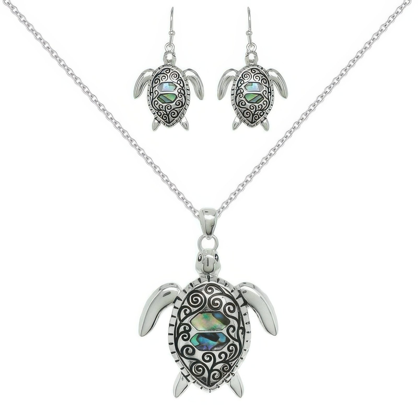 Embrace coastal charm with this abalone marine turtle necklace and earring set