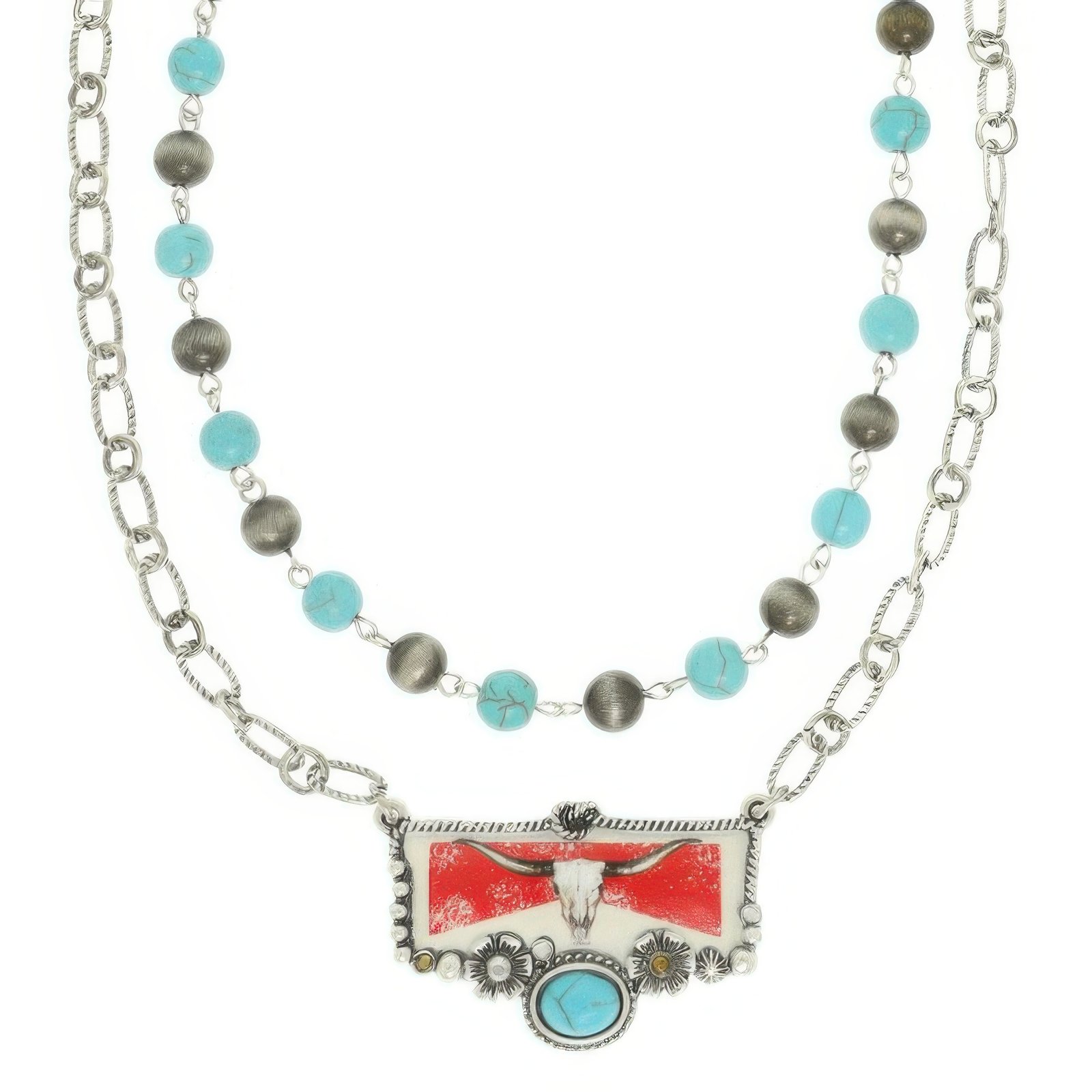This Western multi-strand necklace features a bold enamel steer head pendant accented in turquoise, delivering rustic flair with modern appeal. Designed to layer beautifully, the textured strands offer depth and movement, while the lightweight feel makes it easy to wear from day to night. Pair it with denim or dresses for effortless cowgirl style.