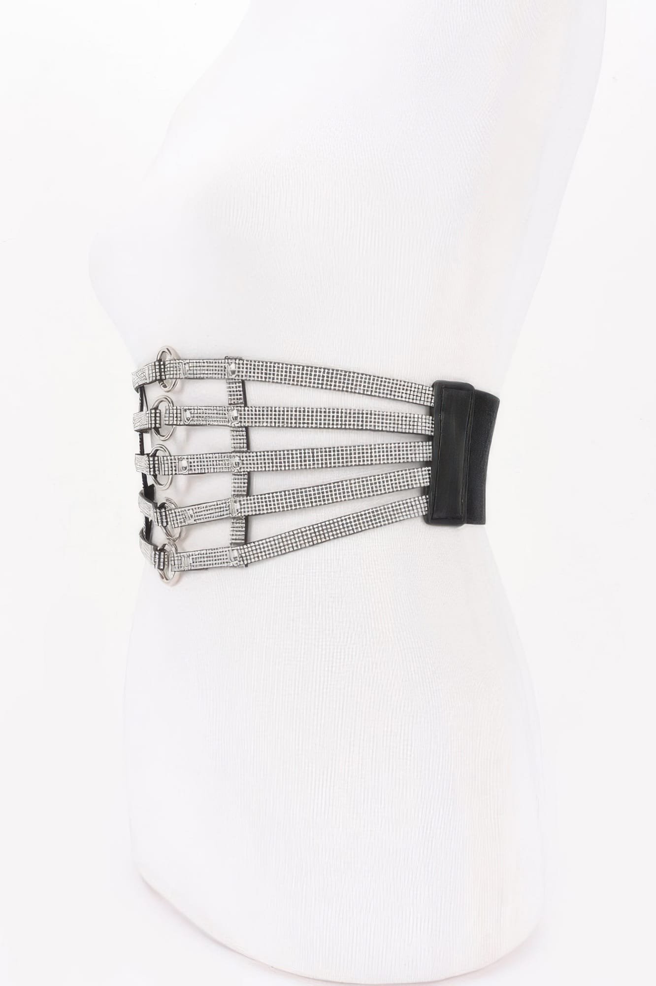 Make a dazzling statement with the Wide Rhinestone Waist Belt, designed to turn heads with its bold sparkle and structured silhouette. Featuring a lattice-style multi-strap design, this belt is richly studded with rhinestones for maximum shine. Metal ring accents connect the straps, creating a captivating geometric look. With its stretch construction and waist-cinching shape, it’s the ultimate accessory for adding drama to any outfit.